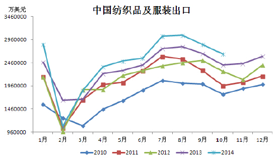 10月紡織服裝出口同比增10.2%。海關(guān)公布的數(shù)據(jù)顯示,10月我國紡織紗線及制品出口97.5億美元,同比增長13.8%,環(huán)比下滑0.05%。1-10月累計(jì)出口928億美元,同比增長5.8%;服裝及衣著附件出口168億美元,同比增長8.2%,環(huán)比下滑10.7%,1-10月累計(jì)出口1556億美元,同比增長6.7%。10月份紡織紗線制品及服裝共出口265億美元,環(huán)比下滑7%,同比增長10.2%。