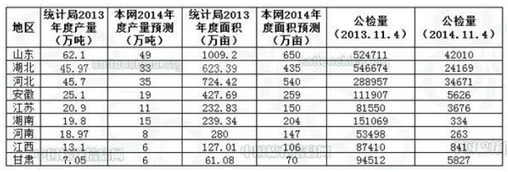 內(nèi)地定額補(bǔ)貼上限2000元/噸,限定9省。發(fā)改委昨日稱(chēng),內(nèi)地補(bǔ)貼范圍為山東、湖北、湖南、河北、江蘇、安徽、河南、江西和甘肅9省,2014年度補(bǔ)貼標(biāo)準(zhǔn)為2000元/噸,以后年度的補(bǔ)貼標(biāo)準(zhǔn)以新疆補(bǔ)貼額的60%為依據(jù),上限不超過(guò)2000元/噸。以下為這9省面積產(chǎn)量情況。