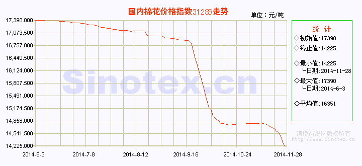 【錦橋紡織網專稿】2014年11月,棉花和紗布市場行情正如初冬的天氣一般寒氣襲人。棉花期現(xiàn)貨市場上旬疲弱下調,中下旬跌勢加大。中國、美國、印度新棉上市帶來的供應壓力抑制著全球棉價,使內外期棉聯(lián)袂下行創(chuàng)新低,國內棉花現(xiàn)貨由相對“平穩(wěn)”轉向加速下跌;下游棉紗與坯布市場價格維持跌勢,需求沒有好轉跡象。