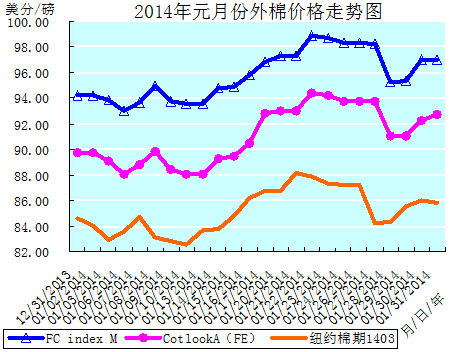 元月份全月統(tǒng)計(jì):紐約棉期1403合約累計(jì)小幅上漲1.19美分/磅,漲幅1.41%,月末運(yùn)行在85.83美分/磅價(jià)位上,仍在80美分/磅整數(shù)價(jià)位之上運(yùn)行。國(guó)際棉花價(jià)格指數(shù)CotlookA(FE)累計(jì)大幅上漲3.05美分/磅,漲幅3.40%,月末運(yùn)行在92.75美分/磅價(jià)位上。中國(guó)進(jìn)口棉價(jià)格指數(shù)FCIndexM累計(jì)大幅上漲2.82美分/磅,漲幅2.99%,月末運(yùn)行在97.01美分/磅價(jià)位上。元月末,中國(guó)進(jìn)口棉價(jià)格指數(shù)FCIndexM分別高于近期ICE期棉1403合約和國(guó)際棉花價(jià)格指數(shù)CotlookA(FE)11.18美分/磅、4.26美分/磅。(參見(jiàn):表一和2014年元月份外棉價(jià)格走勢(shì)圖)