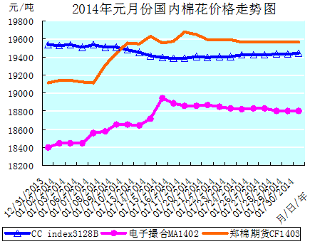 元月份全月統(tǒng)計(jì):中國(guó)棉花價(jià)格指數(shù)CCindex3128B累計(jì)小幅下降92元/噸,降幅0.47%,月末運(yùn)行在19442元/噸價(jià)位上;電子撮合1402合約累計(jì)大幅上漲405元/噸,漲幅2.17%,月末運(yùn)行在18799元/噸價(jià)位上;鄭棉期貨1403合約累計(jì)大幅上漲450元/噸,漲幅2.35%,月末運(yùn)行在19565元/噸價(jià)位上。月末,現(xiàn)貨CCindex3128B價(jià)格比電子撮合1402合約高643元/噸、比鄭棉期貨1403合約低123元/噸。(參見(jiàn):表一和2014年元月份國(guó)內(nèi)棉花價(jià)格走勢(shì)圖)