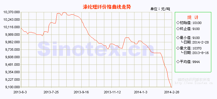 【錦橋紡織網(wǎng)專稿】2月份第4周(2.22-28),滌綸短纖擴(kuò)幅續(xù)跌,成交重心繼續(xù)下移尋底。由于滌綸短纖上游原料PX、PTA、MEG、聚酯切片價格均大幅下跌,使得滌綸短纖成本面失去支撐,聚酯大盤萎靡不振;并且滌綸短纖下游需求啟動緩慢,隨用隨購為主,以致滌綸短纖觀望氣氛濃厚,成交持續(xù)低迷。部分價格競爭較激烈,低價頻出,有低價已觸及9000元/噸位置。此種形勢下,本周滌綸短纖聯(lián)誼會在江蘇東臺召開,與會滌綸短纖廠家就目前狀況進(jìn)行商討,望滌綸短纖主流價能在9200-9300元/噸位置企穩(wěn)。2月28日,1.4Dx38mm滌綸短纖價格運(yùn)行在9100元/噸(比當(dāng)日國內(nèi)3128B級棉花現(xiàn)貨價格低10366元/噸,價差擴(kuò)大),本周累計擴(kuò)幅下跌260元/噸,跌幅2.78%。