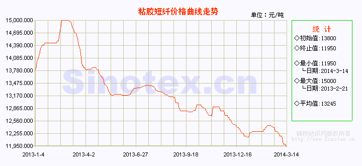【錦橋紡織網(wǎng)專稿】3月份的第二周(3.8-14),粘膠短纖市場價格保持弱勢下行態(tài)勢,擴(kuò)幅續(xù)跌。10日部分中端廠家出臺新政策,大單價格定在12300元/噸,之后粘膠廠家紛紛下調(diào)價格,整體出貨訂單較上周有明顯改善,產(chǎn)銷多近百。目前下游補(bǔ)貨多告一段落,商談成交又趨于清淡。3月14日,粘膠短纖價位運行在11950元/噸(比當(dāng)日國內(nèi)3128B級棉花現(xiàn)貨價格低7495元/噸,價差擴(kuò)大),累計小幅下調(diào)250元/噸,跌幅2.05%。