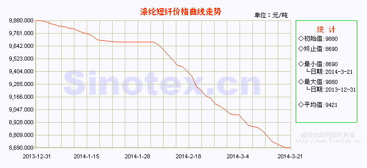 【錦橋紡織網(wǎng)專稿】3月份的第三周(3.15-21),滌短行情繼續(xù)走弱,廠家前期偏高報價普遍下調(diào),市場重心跟隨走低。滌短上游原料PTA、MEG止跌調(diào)整,聚酯切片仍小幅下行。聚酯大盤整體心態(tài)不佳,觀望氣氛濃重。下游對滌短的需求依然不振,市場成交不理想,整體依舊偏弱。目前臨近月底結(jié)算,滌短商家普遍順價走貨,靜等結(jié)算價出臺。3月21日,1.4D×38mm滌綸短纖市場價格運行在8690元/噸(比當(dāng)日國內(nèi)3128B級棉花現(xiàn)貨價格低10732元/噸,價差擴大),本周累計擴幅下跌160元/噸,跌幅1.81%。
