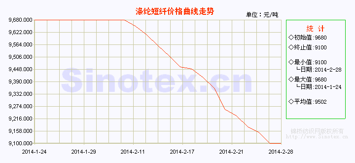 【錦橋紡織網(wǎng)專稿】2014年2月份,滌綸短纖價(jià)格在原料下降的打壓和下游企業(yè)復(fù)工緩慢需求不足的拖拽下弱勢(shì)下行。春節(jié)開市以來(lái),滌綸短纖上游原料價(jià)格大幅下滑,雖國(guó)際原油價(jià)格高位震蕩,但并未能抑制PX、PTA、MEG、聚酯切片等的原料價(jià)格跌勢(shì),滌短成本支撐不足。聚酯大盤整體萎靡不振,詢盤稀少。節(jié)后下游負(fù)荷緩慢回升后,市場(chǎng)不景氣,產(chǎn)品銷售遲滯,以消化庫(kù)存滌綸短纖和小單剛需補(bǔ)貨維持生產(chǎn),滌綸短纖需求沒有完全啟動(dòng)。此外,滌綸短纖出口亦遭到反傾銷調(diào)查的一定影響。種種不利因素作用下,滌綸短纖市場(chǎng)信心匱乏,成交持續(xù)低迷,價(jià)格陰跌不止。預(yù)計(jì)短期內(nèi)滌短價(jià)格仍將繼續(xù)尋底。2月全月統(tǒng)計(jì),滌綸短纖的價(jià)格較上月累計(jì)大幅下降580元/噸,降幅5.99%,月末運(yùn)行在9100元/噸價(jià)位上。