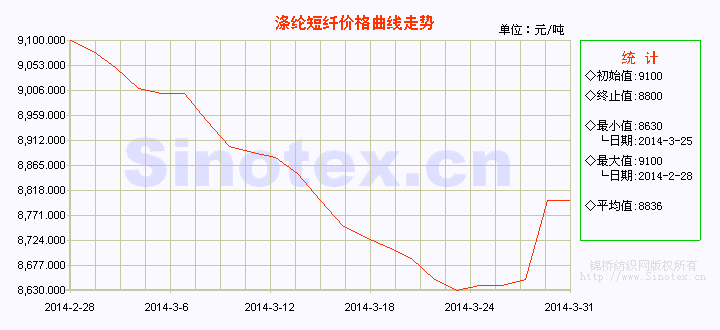 【錦橋紡織網(wǎng)專稿】2014年3月份,滌綸短纖市場(chǎng)行情呈“先跌后漲”的態(tài)勢(shì)。月初至下旬中期(25日)總體上延續(xù)2月份的弱勢(shì)下跌行情,價(jià)格累計(jì)下跌470元/噸,降幅5.16%,跌破了9000元/噸的整數(shù)價(jià)位,不過(guò)跌幅較2月份仍有收窄。臨近月底(26日始)滌短止跌小幅反彈,累計(jì)上漲170元/噸,漲幅1.97%,但價(jià)格仍未能突破9000元/噸的整數(shù)價(jià)位。3月全月統(tǒng)計(jì),滌綸短纖的價(jià)格較上月累計(jì)收幅續(xù)降300元/噸,降幅3.30%,月末運(yùn)行在8800元/噸的價(jià)位上(較同期國(guó)內(nèi)3128B級(jí)棉花現(xiàn)貨價(jià)格低10583元/噸)。一季度以來(lái),滌綸短纖的價(jià)格累計(jì)下跌1080元/噸,跌幅10.93%。