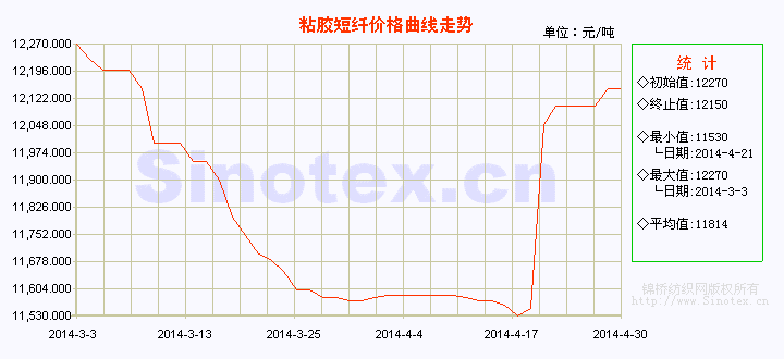 4月初,在粘膠短纖行業(yè)限產(chǎn)增多,下游用戶企業(yè)陸續(xù)剛需補(bǔ)貨的支持下,粘短市場信心有所提振,4月2日起價格止跌微幅上揚(yáng)15元/噸弱勢橫盤維穩(wěn)至14日。