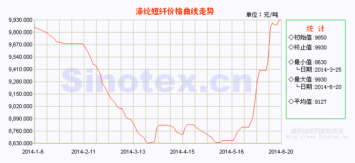 【錦橋紡織網(wǎng)專稿】6月份的第三周(6.16-6.20),滌綸短纖行情先漲后穩(wěn),累計擴幅續(xù)漲。在16日(周一)PTA期貨繼續(xù)大漲的成本強力推動下,廠家扭虧意愿強烈,本周前兩日滌短報價繼續(xù)大幅上調(diào),突破10000元/噸,成交重心繼續(xù)推升,超過年初高位9850元/噸。下游對高價抵觸心理較強,剛需補貨為主,成交寥寥。18日(周三)以后,滌短上游原料PX、PTA、MEG和聚酯切片行情進行調(diào)整,且又臨近月末結(jié)算,聚酯大盤漲勢漸緩,整體趨穩(wěn);滌綸短纖下游開機率偏低,整體需求不理想,滌短行情轉(zhuǎn)為高位僵持狀態(tài)。市場觀望氣氛濃厚,成交價格顯得凌亂,商家出貨意愿增強。預計短期內(nèi)滌綸短纖行情持穩(wěn)的可能性較大。6月20日,1.4D×38mm滌綸短纖市場價格運行在9880元/噸(比當日國內(nèi)3128B級棉花現(xiàn)貨價格低7488元/噸,價差繼續(xù)縮?。?,本周價格累計上漲220元/噸,漲幅4.00%,價格運行在9000元/噸的整數(shù)位之上。