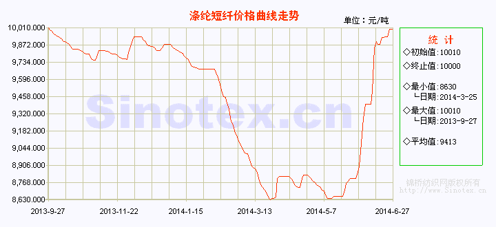 【錦橋紡織網(wǎng)專稿】6月份的第四周(6.23-6.27),滌綸短纖收幅續(xù)漲。本周滌短上游原料PX仍持續(xù)大幅上漲,PTA、MEG、聚酯切片繼續(xù)跟漲,滌短成本支撐依然堅(jiān)挺。同時(shí)又有滌短聯(lián)誼會(huì)會(huì)議精神(23日)及滌短原料高結(jié)的支撐,所以滌短廠家報(bào)價(jià)穩(wěn)中上調(diào)。但由于麥?zhǔn)蘸笙掠螐?fù)工緩慢,需求平淡,滌綸短纖受到牽制,難以達(dá)到量?jī)r(jià)齊飛,因此本周前三日滌短調(diào)漲謹(jǐn)慎,價(jià)格重心緩慢推進(jìn)。但在原料連續(xù)強(qiáng)勢(shì)上漲刺激下,26日(周四),滌短重心突破萬元(達(dá)到2013年9月底以來的最高位),市場(chǎng)整體成交有所放量。受價(jià)格不均衡影響,當(dāng)天廠家產(chǎn)銷差異較大,主流產(chǎn)銷在150-250%。周五,市場(chǎng)報(bào)價(jià)仍有補(bǔ)漲,低價(jià)貨源減少,下游買氣不足。6月27日,1.4D×38mm滌綸短纖市場(chǎng)價(jià)格運(yùn)行在10020元/噸(比當(dāng)日國(guó)內(nèi)3128B級(jí)棉花現(xiàn)貨價(jià)格低7317元/噸,價(jià)差繼續(xù)縮?。局軆r(jià)格累計(jì)上漲140元/噸,漲幅1.42%,價(jià)格運(yùn)行至10000元/噸的整數(shù)位之上。