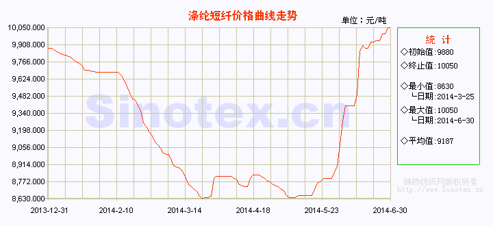 【錦橋紡織網(wǎng)專稿】6月份,滌綸短纖超大幅擴(kuò)幅續(xù)漲。滌綸短纖價(jià)格自5月中旬觸底小幅反彈,進(jìn)入6月份,在原料成本支撐堅(jiān)挺的拉動(dòng)下連續(xù)單邊強(qiáng)力上調(diào),價(jià)位節(jié)節(jié)攀升,接連收復(fù)前期失地。滌綸短纖價(jià)格上中旬單邊大幅上調(diào),下旬穩(wěn)中小幅續(xù)漲。3-9日的“五連陽”累計(jì)上漲600元/噸,漲幅6.82%,并于5日突破9000元/噸的整數(shù)價(jià)位;13-17日的(三連陽)累計(jì)上漲480元/噸,漲幅5.11%;且于月底的26日突破10000元/噸的整數(shù)價(jià)位。全月累計(jì)超大幅單邊提漲1250元/噸,漲幅14.20%。月末運(yùn)行在10050元/噸的價(jià)位上(比同期國內(nèi)3128B級(jí)棉花現(xiàn)貨價(jià)格低7282元/噸,價(jià)差繼續(xù)縮?。?,這是滌綸短纖自2013年9月27日以來的最高價(jià)位。