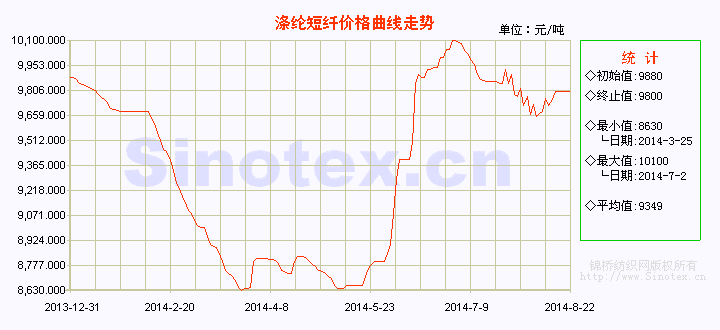 【錦橋紡織網(wǎng)專稿】8月第3周(8.18-8.22),滌綸短纖弱勢盤整格局,價格累計止?jié)q微幅下滑。上游原料原油、PTA、MEG、聚酯切片均弱勢下滑,對滌綸短纖成本支撐作用減弱;終端需求依舊低迷,滌紗疲軟不改,信心不足,按需小單采購,以致滌綸短纖買盤氣氛持續(xù)萎靡,走貨溫吞,廠家產(chǎn)銷不理想。為響應上周(13日)行業(yè)限產(chǎn)保價的倡導,本周滌綸短纖廠家廠商報價雖無力繼續(xù)向行業(yè)會議倡導的萬元靠近,但大都以穩(wěn)價為主導,維持平報,前期偏高價格略有商談,成交重心略松動。8月22日,1.4Dx38mm滌綸短纖價格運行在9730元/噸(比當日國內(nèi)3128B級棉花現(xiàn)貨價格低7271元/噸,價差繼續(xù)縮小),本周價格累計下降10元/噸,降幅0.10%,價格仍運行在10000元/噸的整數(shù)位之下。
