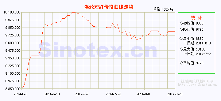 【錦橋紡織網(wǎng)專稿】8月,滌綸短纖行情有所震蕩,上旬和下旬陰跌,中旬單邊小幅上調(diào),價格累計收幅續(xù)降。1-8日價格累計下滑115元/噸,降幅1.18%;11-15日價格累計上漲85元/噸;20-29日價格累計再度下滑50元/噸。全月累計下降130元/噸,降幅1.33%。月末運(yùn)行在9640元/噸的價位上(比同期國內(nèi)3128B級棉花現(xiàn)貨價格低7352元/噸,價差有所縮?。?,價格仍運(yùn)行在10000元/噸的整數(shù)位之下。(見表一)