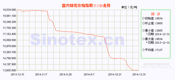 全年統(tǒng)計,中國棉花價格指數(shù)CCindex3128B累計下降5929元/噸,降幅30.35%,年末運行在13605元/噸價位上,比當日電子撮合1501合約高732元/噸、比鄭棉期貨1501合約高420元/噸。