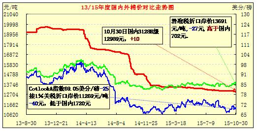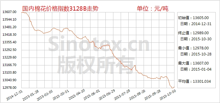 【錦橋紡織網(wǎng)專稿】2015年10月,棉花市場外強(qiáng)內(nèi)弱,ICE期棉及國際現(xiàn)貨棉價(jià)大幅反彈,鄭棉處于下跌趨勢(shì);港口外棉入庫量減少,價(jià)格上漲。國內(nèi)皮棉現(xiàn)貨銷售滯緩,價(jià)格兩級(jí)分化;籽棉收購價(jià)格下滑,中期花上市量逐漸增多,品質(zhì)有所提升。內(nèi)外棉紗價(jià)格繼續(xù)走低,需求萎縮;純棉布整體成交量縮減,價(jià)格延續(xù)下跌趨勢(shì)。
