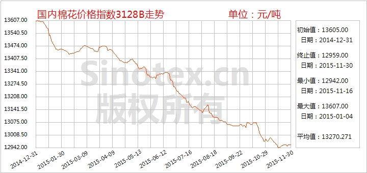 11月30日統(tǒng)計,中國棉花價格指數(shù)CCindex3128B累計下跌30元至12059元/噸;價格比電子撮合1512合約高1048元/噸、比鄭棉期貨1601合約高769元/噸。(參見:表一)