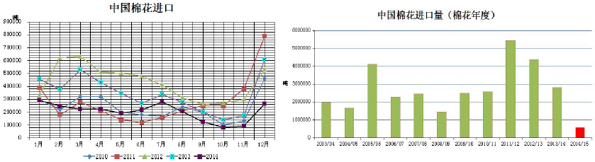 海關(guān)公布的數(shù)據(jù)顯示,2014年12月我國進(jìn)口棉花26.45萬噸,環(huán)比增加17.23萬噸,同比減少34.41萬噸;2014年9-12月,我國累計進(jìn)口棉花56.14萬噸,同比減少50.05%;2014年1-12月,我國累計進(jìn)口棉花243.94萬噸,同比減少41%。