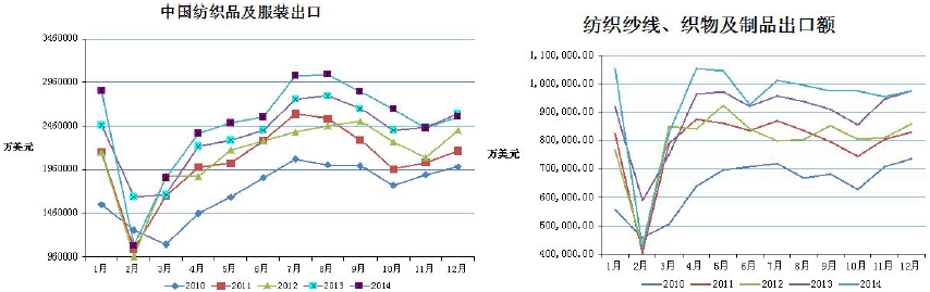 2014年前期,紡織出口同比一直維持增長,但11、12月同比有所下滑,考慮到大宗商品價格普遍下行,企業(yè)原料成本有所降低,因此出口金額下滑。