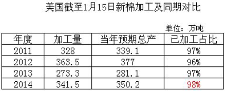 目前美棉本年度加工已經(jīng)接近尾聲,截至1月15日,美國2014年度棉花已加工341萬噸,高于去年同期水平,基本已經(jīng)進(jìn)入加工尾聲。