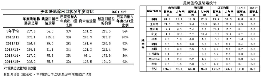 據(jù)美國農(nóng)業(yè)部(USDA),截至2015年1月15日,美國累計簽約出口2014/15年度棉花195萬噸,其中陸地棉簽約191萬噸;裝運棉花67.9萬噸,裝運率34.78%。中國共簽約美棉45.8萬噸,占美棉出口量的23.5%;裝運16萬噸,占美棉裝運量的23.6%,占中國已簽約量的34.9%。
