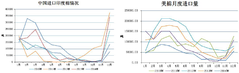 從本年度美棉銷售看,中國的紡織廠的采購有所推遲。2014年年中以來,國內(nèi)外棉價持續(xù)下跌,加之期貨價格跌幅較大,提前跌破13000,因此紡企普遍期待在新年度開始后用上低價棉。但進(jìn)入9月后,新疆由于籽棉收購價較上年大幅下跌,農(nóng)民惜售,開秤推遲;內(nèi)地企業(yè)非常謹(jǐn)慎,普遍觀望,農(nóng)民也嚴(yán)重惜售。而自進(jìn)入新年度后,外棉到港量持續(xù)下降,因此,國內(nèi)供應(yīng)出現(xiàn)階段性緊缺。也推動價格出現(xiàn)了階段性的反彈。