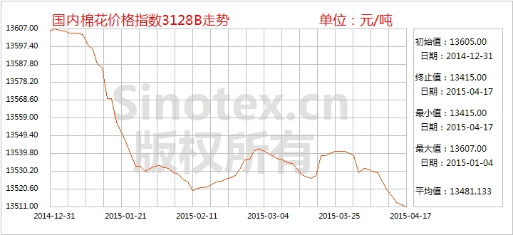 17日統(tǒng)計,中國棉花價格指數(shù)CCindex3128B累計微幅下滑37元/噸,運行在13415元/噸;價格比電子撮合1505合約高800元/噸、比鄭棉期貨1507合約高605元/噸,價差縮小。(參見:表一)