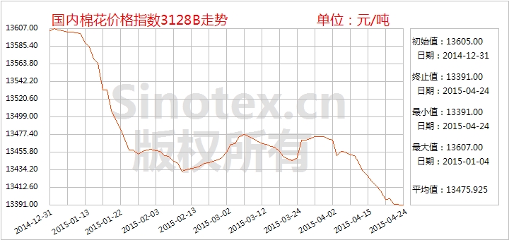 現(xiàn)貨皮棉價格持穩(wěn)偏弱,整體市場并沒有跟隨鄭棉的反彈而啟動。由于近期棉紗好轉(zhuǎn),而紡企大多原料庫存低(15-20天者較常見,甚至有10天以下),因此刺激了部分企業(yè)采購原料,優(yōu)質(zhì)地產(chǎn)棉、新疆棉止跌企穩(wěn),銷售相對順暢.。而內(nèi)地一般品質(zhì)棉花依然乏人問津,庫存接近爆滿,價格仍有下滑。4月24日統(tǒng)計(jì),中國棉花價格指數(shù)CCindex3128B累計(jì)微幅下滑24元/噸,運(yùn)行在13391元/噸;價格比電子撮合1505合約高958元/噸、比鄭棉期貨1507合約高401元/噸。(參見:表一)