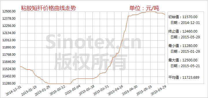 【錦橋紡織網(wǎng)專稿】2015年5月,粘膠短纖行業(yè)缺乏新利好刺激,行情結(jié)束了上月的強(qiáng)勢上漲態(tài)勢,進(jìn)入橫盤整理波段。憑借前期充裕訂單和偏低庫存,粘膠短纖價格尚能維持平穩(wěn),其中,前期表現(xiàn)穩(wěn)中偏強(qiáng)調(diào)整,后期表現(xiàn)穩(wěn)中偏弱調(diào)整。全月統(tǒng)計:1.5Dx38mm粘膠短纖市場均價累計微幅上漲10元,月末運(yùn)行在12460元/噸,價格低于同期中國棉花價格指數(shù)CCindex328(現(xiàn)貨價格)853元/噸,價差較上月縮小92元。