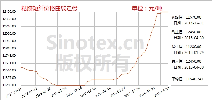 全月統(tǒng)計(jì):1.5Dx38mm粘膠短纖均價(jià)累計(jì)大幅上漲970元(8.45%),月末運(yùn)行在12450元/噸,價(jià)格低于同期中國(guó)棉花價(jià)格指數(shù)CCindex328(現(xiàn)貨價(jià)格)945元/噸,價(jià)差較上月大幅縮小1050元。2015年春節(jié)開(kāi)市以來(lái),粘膠短纖價(jià)格累計(jì)上漲1170元/噸,漲幅10.37%。
