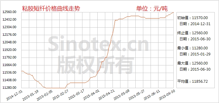 【錦橋紡織網(wǎng)專稿】2015年6月,粘膠短纖價格走勢先穩(wěn)后升。其中,上中旬市場多空僵持,價格延續(xù)5月的盤整態(tài)勢,以平穩(wěn)運行為主;下旬,在原料堅挺、供應減少以及需求轉(zhuǎn)好帶動下,粘膠短纖價格小幅上漲百元附近。全月統(tǒng)計:1.5Dx38mm粘膠短纖市場均價累計小幅上漲100元,月末運行在12560元/噸,價格低于同期中國棉花價格指數(shù)CCindex328(現(xiàn)貨價格)703元/噸,價差較上月繼續(xù)縮小150元。2015年1-6月份,1.5Dx38mm粘膠短纖市場均價累計大幅上漲990元,漲幅8.56%。