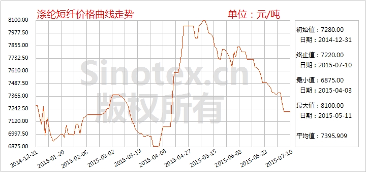 【錦橋紡織網(wǎng)專稿】2015年7月上旬,滌綸短纖價(jià)格短暫波動(dòng)后繼續(xù)下跌走勢(shì),累計(jì)跌幅接近200元/噸。月初在PTA裝置減產(chǎn)利好下,原料市場(chǎng)價(jià)格小幅反彈,支撐滌綸短纖止跌并出現(xiàn)向好跡象;然而,國(guó)際油價(jià)的暴跌行情使裝置檢修利好如曇花一現(xiàn),滌綸短纖原料價(jià)格大幅回落,微弱的支撐塌陷后,滌綸短纖回歸下跌走勢(shì)。7月10日統(tǒng)計(jì),1.4D直紡滌綸短纖價(jià)格累計(jì)小幅下跌180元至7220元/噸,跌幅2.43%,仍運(yùn)行在至8000元/噸整數(shù)位之下,比同期國(guó)內(nèi)3128B級(jí)棉花現(xiàn)貨價(jià)格指數(shù)低5983元/噸,價(jià)差較上周擴(kuò)大167元/噸(見(jiàn)表一)