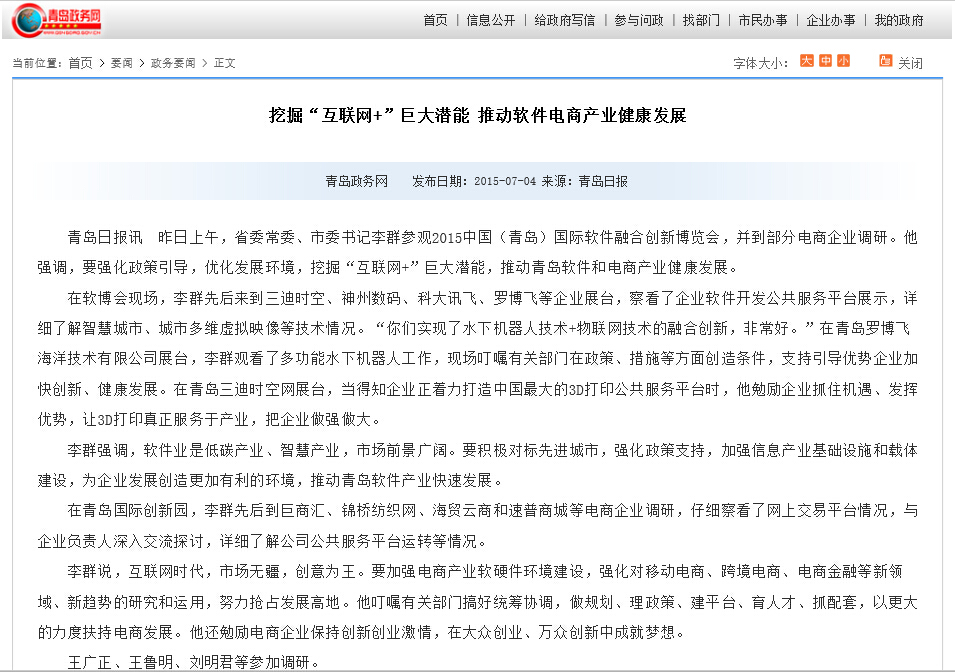 青島政務(wù)網(wǎng)報道:挖掘“互聯(lián)網(wǎng)+”巨大潛能 推動軟件電商產(chǎn)業(yè)健康發(fā)展