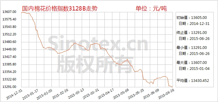 6月上中旬,面對(duì)鄭棉、ICE期棉破位下跌,發(fā)改委證實(shí)儲(chǔ)備棉出庫(kù)在即(6月11日)以及進(jìn)口棉在未來(lái)兩個(gè)月大量到港,下游市場(chǎng)不佳等不利因素,市場(chǎng)恐慌情緒滋生?,F(xiàn)貨去庫(kù)存化進(jìn)程加快,棉價(jià)走勢(shì)略顯震蕩,但價(jià)格表現(xiàn)依然分化,中高等級(jí)小幅上調(diào),低等級(jí)繼續(xù)小降。進(jìn)入下旬,部分倉(cāng)庫(kù)接到中國(guó)儲(chǔ)棉下發(fā)的的2015年第1批儲(chǔ)備棉出庫(kù)打捆通知(6月25日),6月30日,儲(chǔ)備棉輪出細(xì)則塵埃落定。拋儲(chǔ)細(xì)則進(jìn)一步明確過(guò)程中,紡企放慢了原料采購(gòu)步伐,嚴(yán)格控制棉花庫(kù)存,基本維持在2周左右,部分企業(yè)縮短至1周以?xún)?nèi),以降低企業(yè)經(jīng)營(yíng)風(fēng)險(xiǎn);疆內(nèi)棉企的還貸壓力、銷(xiāo)售壓力及資金回收壓力越來(lái)越大,部分棉企為了加快銷(xiāo)售,開(kāi)始低價(jià)進(jìn)行銷(xiāo)售,造成市場(chǎng)現(xiàn)貨報(bào)價(jià)較為混亂。6月30日統(tǒng)計(jì),中國(guó)棉花價(jià)格指數(shù)CCindex3128B累計(jì)下跌50元/噸,月末價(jià)位在13263元/噸;價(jià)格比電子撮合1507合約高713元/噸、比鄭棉期貨1507合約高823元/噸,價(jià)差擴(kuò)大。(參見(jiàn):表一)中國(guó)棉花價(jià)格指數(shù)CCindex3128B上半年累計(jì)下跌342元/噸,跌幅2.51%。