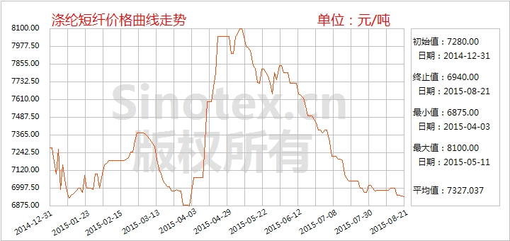 【錦橋紡織網(wǎng)專稿】2015年8月前3周,滌綸短纖跌勢較7月明顯減緩,其走勢跟隨聚酯大盤窄幅震蕩,價格累計小幅下調(diào)。8月21日統(tǒng)計,1.4D直紡滌綸短纖價格累計小幅下跌90元/噸至6930元/噸,跌幅1.28%,運(yùn)行在7000元/噸整數(shù)位之下(見表一),比同期國內(nèi)3128B級棉花現(xiàn)貨價格指數(shù)低6173元/噸。