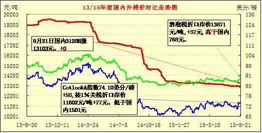 隨著ICE期棉漲至高位,外棉報(bào)價(jià)也水漲船高,港口外棉CIF報(bào)價(jià)、已清關(guān)高等級(jí)外棉報(bào)價(jià)大幅高于買方心理承受上限(落差3-5美分/磅);導(dǎo)致8月中旬以來除澳棉、巴西棉和少數(shù)高品質(zhì)美棉有詢價(jià)、成交外,其它產(chǎn)地的棉花出貨困難,港口外棉庫存依舊存在壓力。8月20日,港口通關(guān)進(jìn)口棉美棉SM1-1/8報(bào)15000-15200元/噸,澳棉SM1-5/32報(bào)16000-16500元/噸,商談優(yōu)惠。而國內(nèi)期貨、棉花現(xiàn)貨價(jià)格持續(xù)走低,再加上2015/16年度新棉上市的預(yù)期日漸強(qiáng)烈、國儲(chǔ)棉競賣成交比例低迷,因此,7、8月國內(nèi)市場1%關(guān)稅內(nèi)棉花進(jìn)口配額轉(zhuǎn)讓、代理進(jìn)口的現(xiàn)象越來越少,配額轉(zhuǎn)讓價(jià)格從4、5月份最高的2800-3000元/噸一路上跌至目前1700-1800元/噸。8月21日統(tǒng)計(jì),代表進(jìn)口棉中國主港到岸均價(jià)的中國進(jìn)口棉價(jià)格指數(shù)FCIndexM累計(jì)上漲2.04美分/磅至73.14美分/磅(參見:表一)。按1%關(guān)稅和滑準(zhǔn)稅計(jì)算,折人民幣價(jià)格分別為11454元/噸和13794元/噸,與當(dāng)日中國棉花價(jià)格指數(shù)3128B棉相比,國內(nèi)棉價(jià)與進(jìn)口棉的價(jià)差分別為1649元/噸和-691元/噸,滑準(zhǔn)稅下外棉價(jià)格繼續(xù)反超國棉。中國棉花價(jià)格指數(shù)3128B棉與Cotlook價(jià)格指數(shù)對(duì)比如下圖: