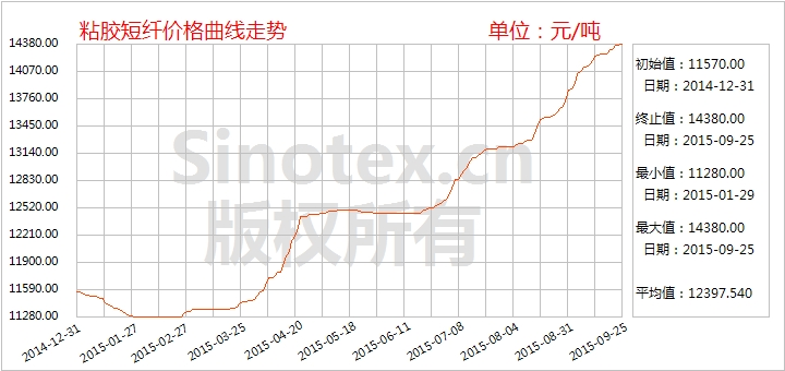 【錦橋紡織網(wǎng)專稿】2015年9月,粘膠短纖行情繼續(xù)處于上升通道。由于供需持續(xù)改善,自2015年3月以來粘膠短纖行業(yè)景氣度持續(xù)提升,在化纖產(chǎn)品普跌的蕭條氛圍中逆市上揚,一枝獨秀。進入9月,粘膠廠家前期訂單仍舊普遍較為充裕,供應(yīng)發(fā)貨長期偏緊,心態(tài)穩(wěn)中偏多,價格執(zhí)行到位,市場成交重心持續(xù)上移;加之上游漿粕價格持續(xù)拉漲的支撐,下游人棉紗買漲不買跌,價格小幅跟漲。截至9月25日,1.5Dx38mm粘膠短纖市場均價累計上漲600元,漲幅4.35%,月末運行在14380元/噸,價格高于同期中國棉花價格指數(shù)CCindex328現(xiàn)貨價格1324元/噸,棉粘價格倒掛,并且價差較上月繼續(xù)擴大1242元。中端主流報價至14500-146000元/噸,高端報價至14600-14700元/噸;實際成交重心跟隨走高,中端主流商談重心在14400元/噸,高端成交重心在14600-14700元/噸。部分新投產(chǎn)廠家報價也有一定跟進,商談成交多在14200元/噸水平。第三季度以來,1.5Dx38mm粘膠短纖市場均價累計上漲1820元,漲幅14.49%。國慶假期臨近,關(guān)注下游紗布備貨進展、放假情況以及部分粘膠廠家生產(chǎn)恢復(fù)進展。