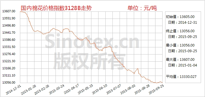 9月25日統(tǒng)計(jì),中國棉花價(jià)格指數(shù)CCindex3128B累計(jì)微跌3元/噸,周末價(jià)位在13056元/噸;價(jià)格比電子撮合1510合約高977元/噸、比鄭棉期貨1511合約高551元/噸。(參見:表一)