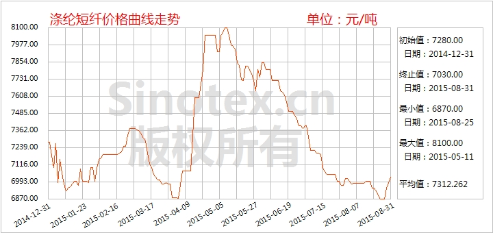 【錦橋紡織網(wǎng)專稿】2015年8月,滌綸短纖跟隨聚酯大盤窄幅震蕩,走勢先抑后揚(yáng),價(jià)格創(chuàng)年內(nèi)新低后于月末小幅反彈。滌綸短纖整體走勢窄幅震蕩,價(jià)格累計(jì)小幅下調(diào)150元/噸至6870元/噸(8月25日)的年度新低,跌幅較7月份明顯減緩,市場成交氣氛清淡;唯月末二日(28日和29日),油價(jià)帶動(dòng)PTA期貨大漲,聚酯大盤氣氛向上,滌綸短纖集中反彈230元/噸,收回了全月跌幅,并且市場采購成交氣氛較好。近期成本大降,滌綸短纖現(xiàn)金流盈利逾500元/噸。后期走勢需關(guān)注原油、聚酯原料價(jià)格及下游旺季啟動(dòng)情況。8月31日統(tǒng)計(jì),1.4D直紡滌綸短纖價(jià)格累計(jì)小幅上漲80元/噸,漲幅1.14%,月末價(jià)格7100元/噸,運(yùn)行在7000元/噸整數(shù)位之上(見表一),比同期國內(nèi)3128B級(jí)棉花現(xiàn)貨價(jià)格指數(shù)低59796118元/噸,價(jià)差較上月縮小138元/噸。月末,江浙1.4D直紡滌綸短纖主流報(bào)價(jià)7150-7200元/噸出廠;福建1.4D直紡滌綸短纖主流報(bào)加6900-7000元/噸短送;山東、河北1.4直紡滌綸短纖主流報(bào)價(jià)7150-7250元/噸送到。