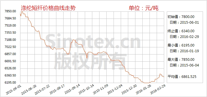 【錦橋紡織網(wǎng)專稿】2016年2月,國際原油觸底反彈及裝置檢修支撐聚酯原料價格堅挺,成本面拉動滌綸短纖走勢穩(wěn)中偏上。2月29日統(tǒng)計,1.4D直紡滌綸短纖價格累計上漲180元至6340元/噸,漲幅2.92%。價格仍運行在7000元/噸整數(shù)位之下(見表一),比當(dāng)日國內(nèi)3128B級棉花現(xiàn)貨價格指數(shù)低5750元/噸。棉滌價差仍處于高位,滌綸短纖對棉花的替代作用仍較強(qiáng)。當(dāng)日,福建1.4D直紡滌綸短纖主流報價6300-6400元/噸短送,山東、河北1.4D直紡滌綸短纖主流報價6350-6450元/噸送到。