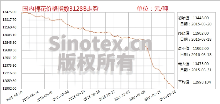 3月20日統(tǒng)計,中國棉花價格指數(shù)CCindex3128B累計下跌188元(-1.56%)至11902元/噸;價格比電子撮合1604合約高1322元/噸、比鄭棉期貨1605合約高987元/噸。(參見:表一)