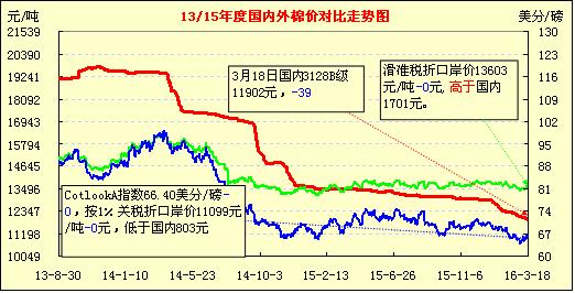 【錦橋紡織網(wǎng)專稿】3月上中旬,中國輪儲因素依然主導全球棉價。內(nèi)外期棉觸底后震蕩反彈。國內(nèi)棉花現(xiàn)貨仍在尋底,但跌勢趨緩。輪儲在即紡企購棉依然謹慎。中國明確儲備棉將在4月底輪出,相關細則尚未公布。18日,國家發(fā)改委公布2016年新疆棉花目標價格水平為每噸18600元,對棉市影響尚未明顯體現(xiàn)。下游棉紗降幅收窄,訂單仍以少、小、短為主;純棉布廠家整體開工仍相對不佳。進口紗JC21S、JC32S、JC40S對國產(chǎn)紗沖擊加大。