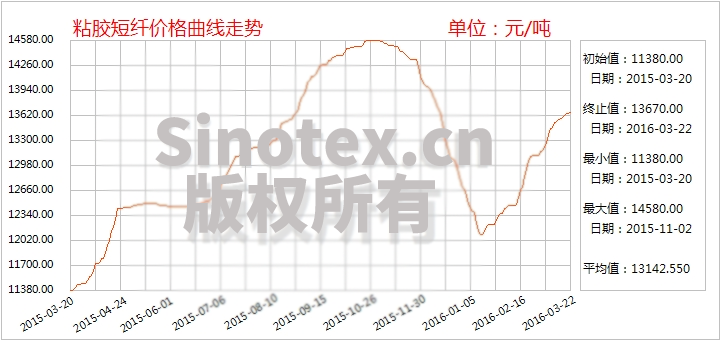 【錦橋紡織網(wǎng)專稿】3月份以來,成本拉動(dòng)及供需結(jié)構(gòu)良好繼續(xù)推動(dòng)粘膠短纖在上漲通道中強(qiáng)勢前行,產(chǎn)業(yè)鏈整體氛圍較好,在整個(gè)化纖原料市場表現(xiàn)依舊亮眼。上游有國內(nèi)外漿粕原料上漲的成本拉動(dòng);下游人棉紗訂單表現(xiàn)向好,紗布價(jià)格跟漲順暢;粘膠短纖廠家自身產(chǎn)銷良好,延續(xù)低庫存運(yùn)行,且普遍有超簽訂單待執(zhí)行,因此心態(tài)普遍偏多,報(bào)價(jià)慣性走高。截至3月22日,1.5Dx38mm粘膠短纖市場均價(jià)累計(jì)上漲550元至13670元/噸,漲幅4.19%。而同期棉花現(xiàn)貨價(jià)格繼續(xù)走低,當(dāng)日粘膠短纖價(jià)格高于中國棉花價(jià)格指數(shù)CCindex328現(xiàn)貨價(jià)格約1961元/噸,粘棉價(jià)差繼續(xù)擴(kuò)大。1.2Dx38mm粘膠短纖市場均價(jià)累計(jì)上漲720元至14000元/噸,漲幅5.42%。2016年1月中旬以來,粘膠短纖中端市場價(jià)格已累計(jì)上漲1600元/噸,漲幅13.26%。