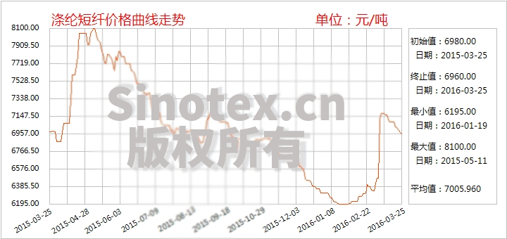 3月中旬以來(3月11-25日),隨著國際油價走勢震蕩,PTA裝置開工穩(wěn)中回升,聚酯大盤亦震蕩整理,上游成本支撐減弱;下游因尚有前期原料儲備,追高態(tài)度謹(jǐn)慎,買盤力度欠佳;因此,滌綸短纖價格走勢弱勢回調(diào),市場成交重心自7180元/噸的年度高位累計小幅回調(diào)220元/噸。滌綸短纖自春節(jié)以來的上漲行情暫告一段落。期間因油價再探新高(每桶突破40美元),17-18日,雖聚酯原料普漲帶動滌綸短纖市場成交尚可,市場出現(xiàn)千噸大單成交,但滌綸短纖報價暫穩(wěn),廠家出貨意向主導(dǎo)。隨后滌短價格延續(xù)弱勢調(diào)整,上下游走弱背景下,滌綸短纖或延續(xù)弱勢。