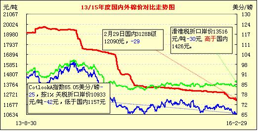 2月29日統(tǒng)計,代表進口棉中國主港到岸均價的中國進口棉價格指數(shù)FCIndexM累計下跌3.56美分/磅至65.68美分/磅(參見:表一)。按1%關稅和滑準稅計算,折人民幣價格分別為11037元/噸和13570元/噸,與當日中國棉花價格指數(shù)3128B棉相比,國內(nèi)棉價與進口棉的價差分別為1053元/噸和-1480元/噸。中國棉花價格指數(shù)3128B棉與Cotlook價格指數(shù)對比如下圖: