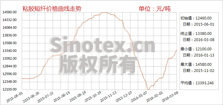 自1月中旬起,粘膠短纖價(jià)格筑底(12000元/噸)回升重返上升通道。2月份雖適逢傳統(tǒng)春節(jié)假期,但節(jié)前人棉紗備貨良好,節(jié)后人棉紗布廠家復(fù)工情況好于預(yù)期,繼續(xù)補(bǔ)充庫(kù)存,致粘膠短纖廠家供應(yīng)偏緊,從而支撐報(bào)價(jià)節(jié)節(jié)高攀迎來(lái)開(kāi)門紅。2月粘膠短纖價(jià)格累計(jì)大幅上漲750元/噸(6.06%)。進(jìn)入陽(yáng)春三月,粘膠短纖市場(chǎng)仍是一片“艷陽(yáng)天”。2016年1月中旬至3月8日,粘膠短纖價(jià)格累計(jì)上漲1380元/噸,漲幅11.5%。目前,國(guó)內(nèi)外漿粕價(jià)格多有拉漲空間,粘膠短纖主流廠家普遍訂單充裕,供應(yīng)偏緊;下游跟漲順暢,交投氣氛尚可。從成本以及供需結(jié)構(gòu)來(lái)看,后期粘膠短纖將繼續(xù)延續(xù)上漲勢(shì)頭,把握上漲節(jié)奏關(guān)注產(chǎn)業(yè)鏈各環(huán)節(jié)經(jīng)營(yíng)情況。
