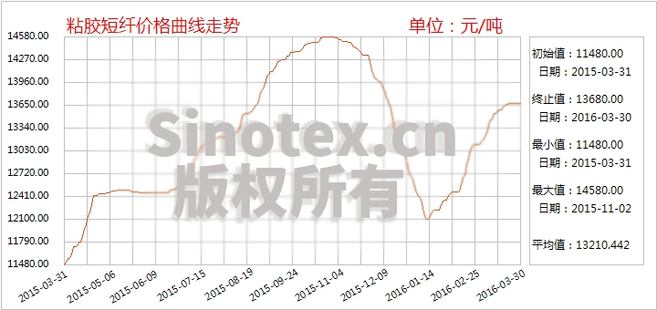 【錦橋紡織網(wǎng)專稿】2016年3月份,在成本拉動(dòng)及供需結(jié)構(gòu)良好的推動(dòng)下,粘膠短纖在上漲通道中強(qiáng)勢(shì)前行,價(jià)格沖高后基本維穩(wěn)。截至3月31日,1.5Dx38mm粘膠短纖市場(chǎng)均價(jià)累計(jì)上漲580元至13700元/噸,漲幅4.42%。而同期棉花現(xiàn)貨價(jià)格繼續(xù)走低,當(dāng)日粘膠短纖價(jià)格高于中國(guó)棉花價(jià)格指數(shù)CCindex328現(xiàn)貨價(jià)格約2022元/噸,粘棉價(jià)差繼續(xù)擴(kuò)大。1.2Dx38mm粘膠短纖市場(chǎng)均價(jià)累計(jì)上漲720元至14000元/噸,漲幅5.42%。2016年1月中旬以來,粘膠短纖中端市場(chǎng)價(jià)格已累計(jì)上漲1700元/噸,漲幅14.17%。