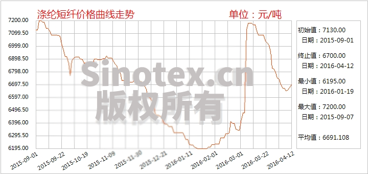 進入中旬,國際油價大漲重返40美元,推動聚酯大盤穩(wěn)中偏強調整,滌綸短纖廠家報價也穩(wěn)中略上抬,出現反彈跡象,前期弱勢回調態(tài)勢暫告一段落,后期價格走勢應關注油價及PTA和下游市場動態(tài)。4月11日,江浙1.4D直紡滌短市場主流報6650-6800元/噸出廠,實際成交商談。福建滌短市場1.4D直紡滌短市場主流報6700元/噸短送。山東、河北市場1.4D直紡滌短主流報6750-6800元/噸送到,目前滌短現金流虧損150元/噸附近。