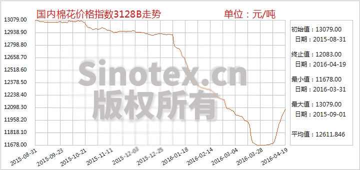 4月18日統(tǒng)計,中國棉花價格指數(shù)CCindex3128B累計上漲323元(2.77%)至12001元/噸;價格比電子撮合1605合約高508元/噸、比鄭棉期貨1605合約高331元/噸,價差較3月末大幅縮小。(參見:表一)據(jù)測算,上周儲備棉輪出銷售底價(折標準級3128B)平均值為11548元/噸,低于當周中國棉花價格指數(shù)CCindex3128B平均價280元/噸。