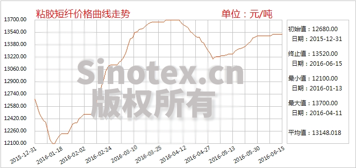 自2016年1月中旬至4月上旬,在成本拉動及供需結(jié)構(gòu)良好的推動下,粘膠短纖市場價格成功筑底步入上升通道;1.5Dx38mm粘膠短纖市場價格累計上漲1700元至13700元/噸(4月11日)的階段高位,由于下游紗廠備貨遲滯需求降低,價格進一步上行受阻,于是在4月中下旬進行短暫的回落調(diào)整,1.5Dx38mm粘膠短纖市場價格回落至13270元/噸;5月份,主流大廠相繼檢修,且上游棉短絨原料延續(xù)強勢拉漲態(tài)勢,提振了市場信心;同時,下游紗廠展開集中剛需補庫操作,因此粘膠短纖廠家?guī)齑鎵毫Φ玫捷^大緩解,報價再度步入上升通道,但與一季度相比漲勢較緩,1.5Dx38mm粘膠短纖市場價格累計上漲230元至13500元/噸。