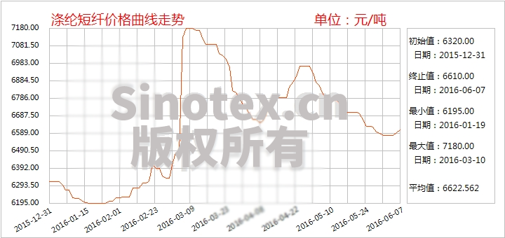 滌綸短纖自春節(jié)起掀起一輪上漲行情,并于3月上旬觸及今年以來的最高水平7180元/噸(3月8日);3月中旬至4月上旬弱勢下調(diào),價格回落至6650元/噸的水平;4月中下旬再度反彈至6970元/噸,5月份滌綸短纖行情復(fù)歸陰跌局面,下探至6590元/噸的今年以來的低位。進(jìn)入6月,油價上漲突破50美元關(guān)口,聚酯大盤氣氛略上,原料市場價格止跌略有反彈,滌短廠家報價小漲50元/噸,市場觀望氣氛為主,預(yù)計短期難有大幅漲跌。6月7日,江浙1.4D直紡滌短主流報6600-6750元/噸出廠,福建市場1.4D直紡滌短主流報6500-6550元/噸短送,山東、河北市場1.4D直紡滌短主流報6700-6800元/噸省內(nèi)送到,實際成交商談,目前滌短現(xiàn)金流虧損50元/噸附近。