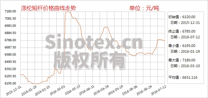 2016年7月中石化滌短預(yù)收款報(bào)價(jià):1.4D半光滌短報(bào)7000元/噸;1.2D有光滌短報(bào)7550元/噸。